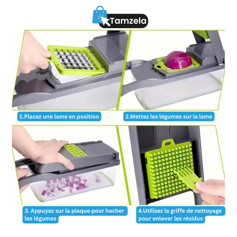 Grâce à ses 12 lames interchangeables en acier inoxydable, il offre des coupes précises et rapides. Éco-friendly, sans BPA et durable, le ChopMaster rend la cuisine plus rapide, propre et agréable.